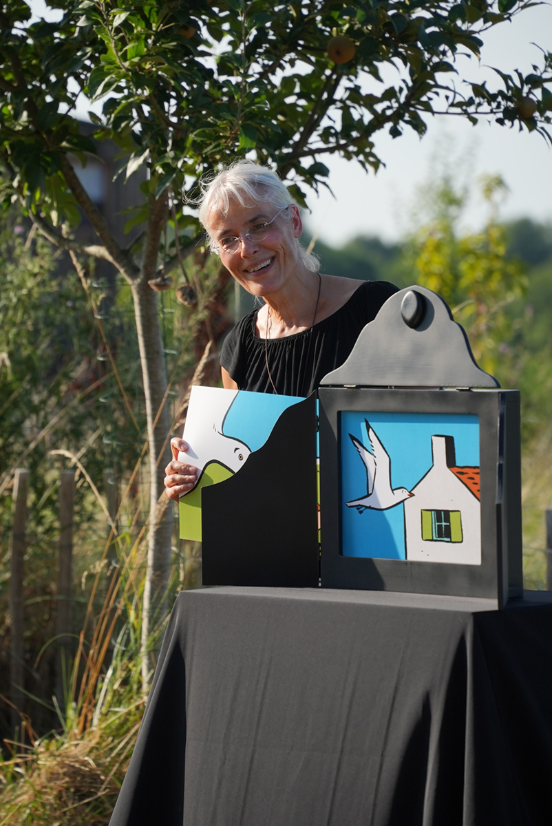 Je suis illustratrice, et le dessin est une de mes raisons d’être heureuse en ce monde. J’aime aussi raconter des histoires. Ainsi le kamishibaï me permet d’allier l’image et la parole vivante et de partager mes créations avec les autres, les petits et les grands. Je ponctue certaines histoires en chantant et en m’accompagnant d’instruments de musique.